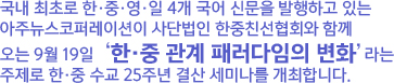 아주뉴스코퍼레이션은 이번 포럼에서 한·중 관계의 어제와 오늘을 정확히 진단하고 새로운 미래의 창을 열고자 합니다. 특히 의원들을 포함해 분야별 중국 전문가 25명이 토론자로 나서 한·중 관계의 미래지향적인 방안을 제시합니다.