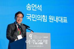 - 송언석 국민의힘 원내대표가 24일 오후 서울 중구 더플라자 호텔에서 '인공지능 아니면 죽음(AI or Die)'이라는 주제로 열린 '제17회 착한 성장, 좋은 일자리 글로벌포럼(2025 GGGF)'에서 축사를 하고 있다. 2025.09.24